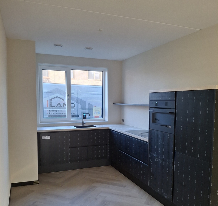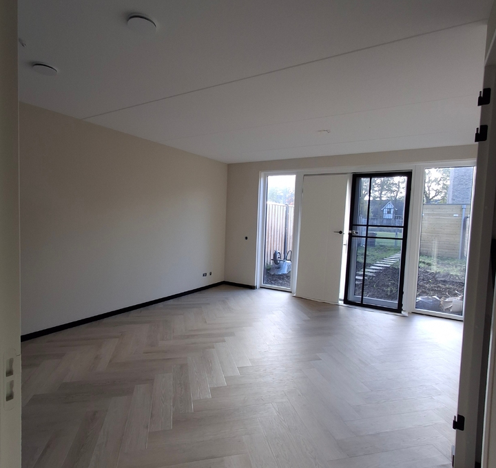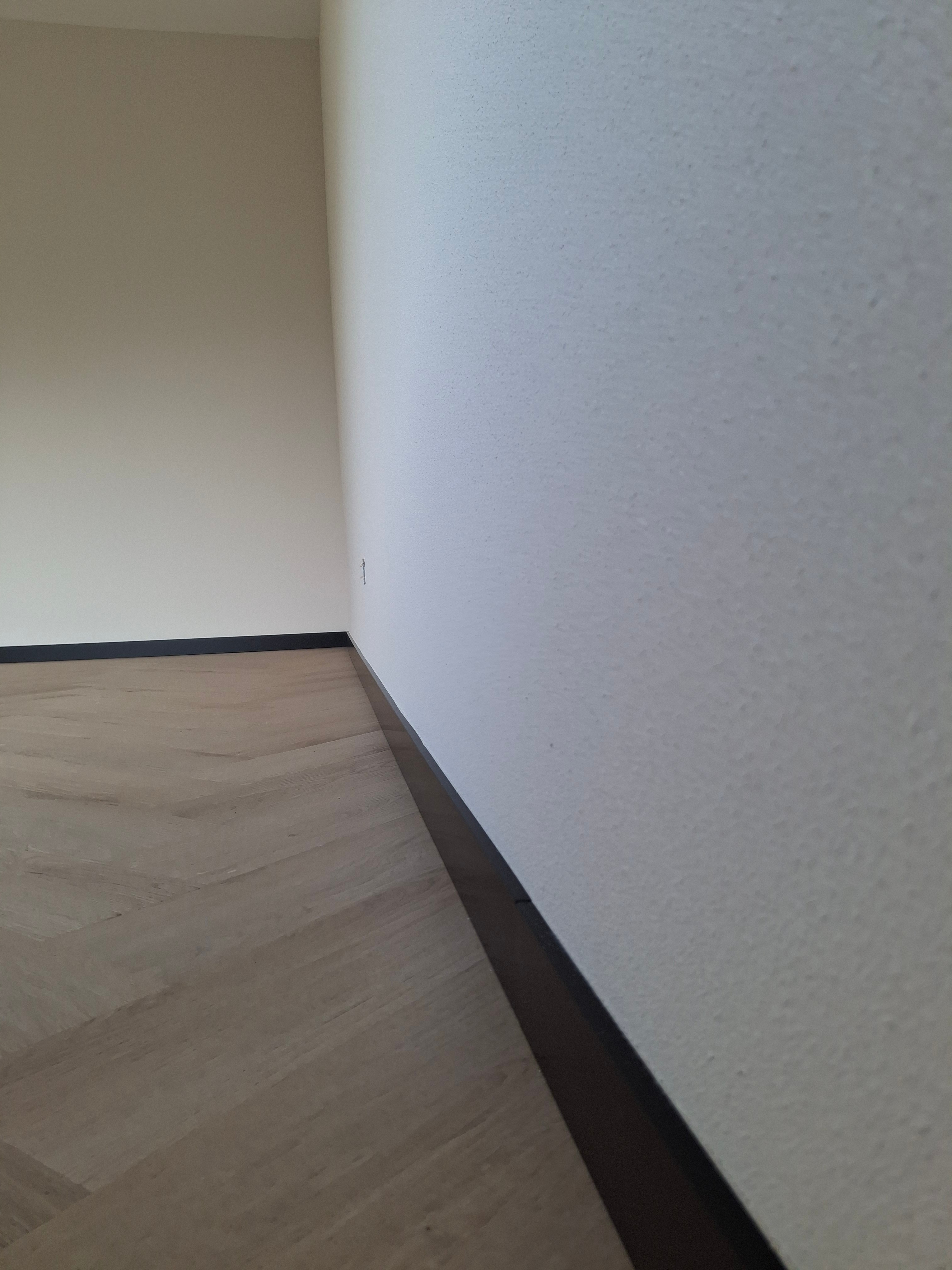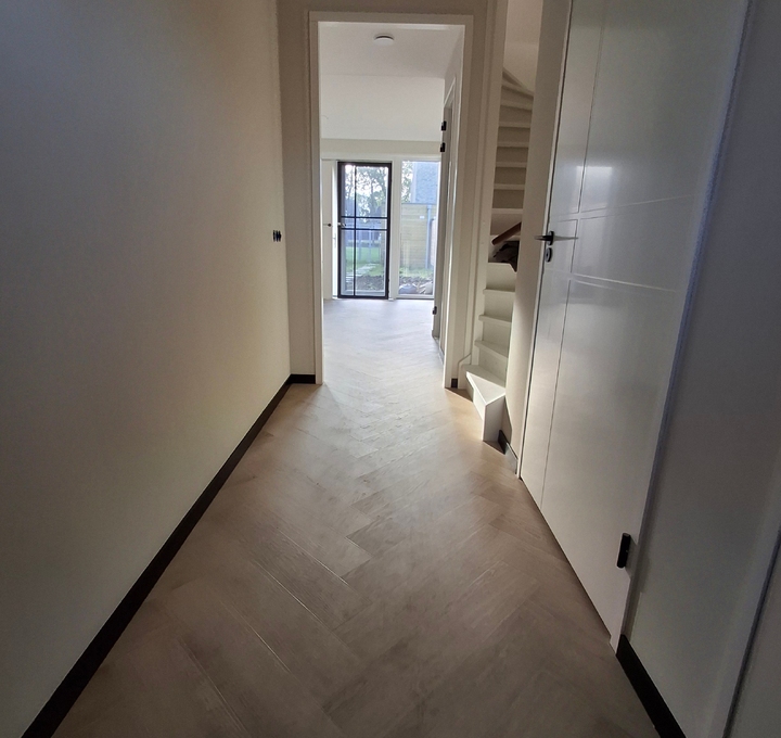 Strak met structuur. In combinatie met de witte plafonds en de visgraad vloer geeft dit een moderne en luxe uitstraling.