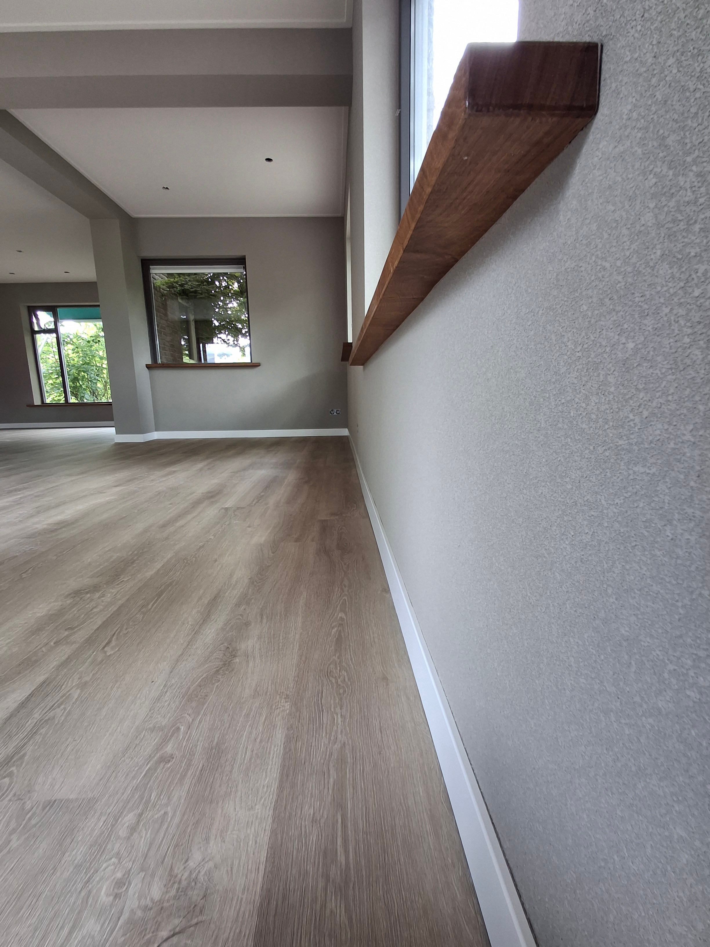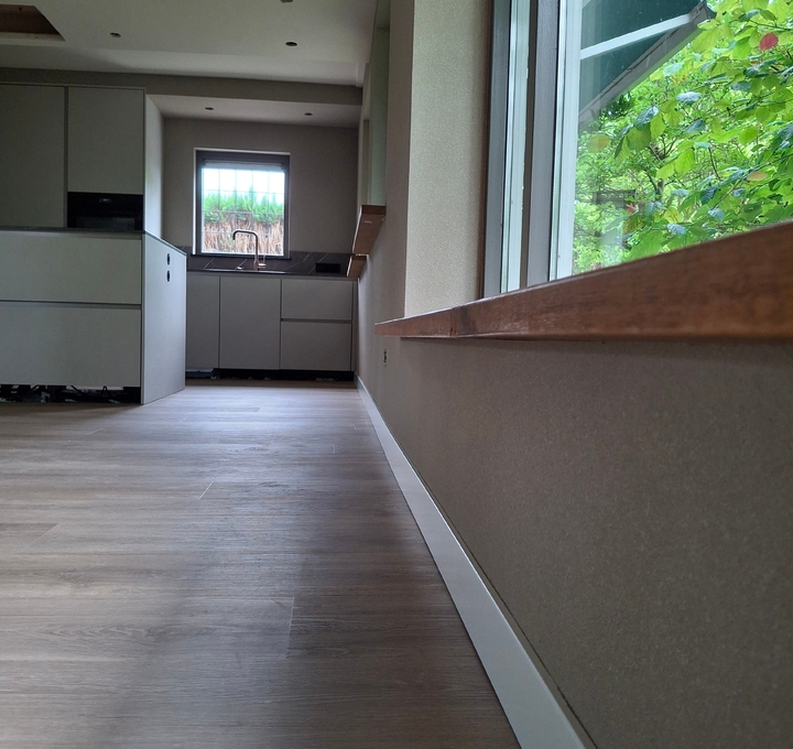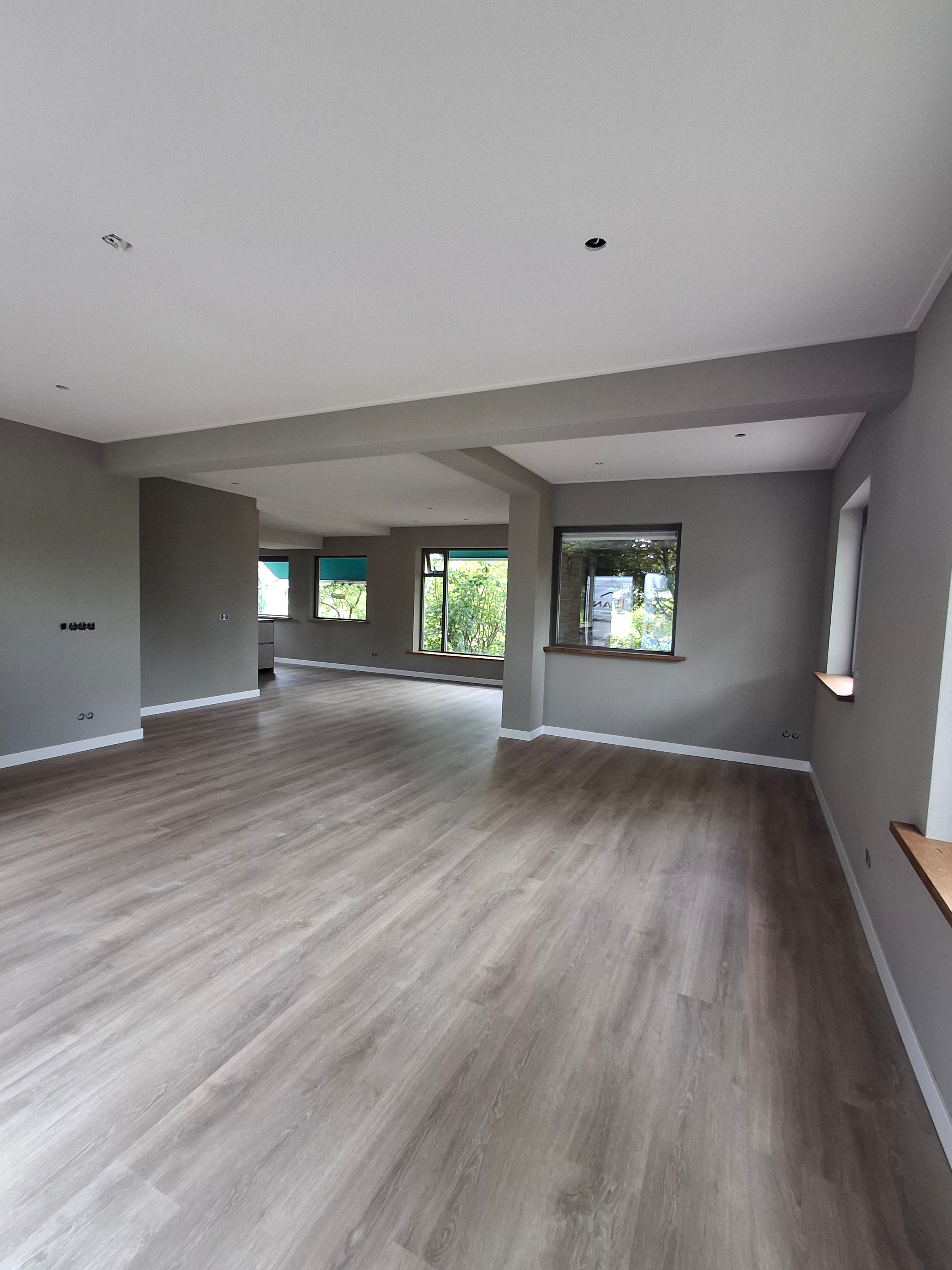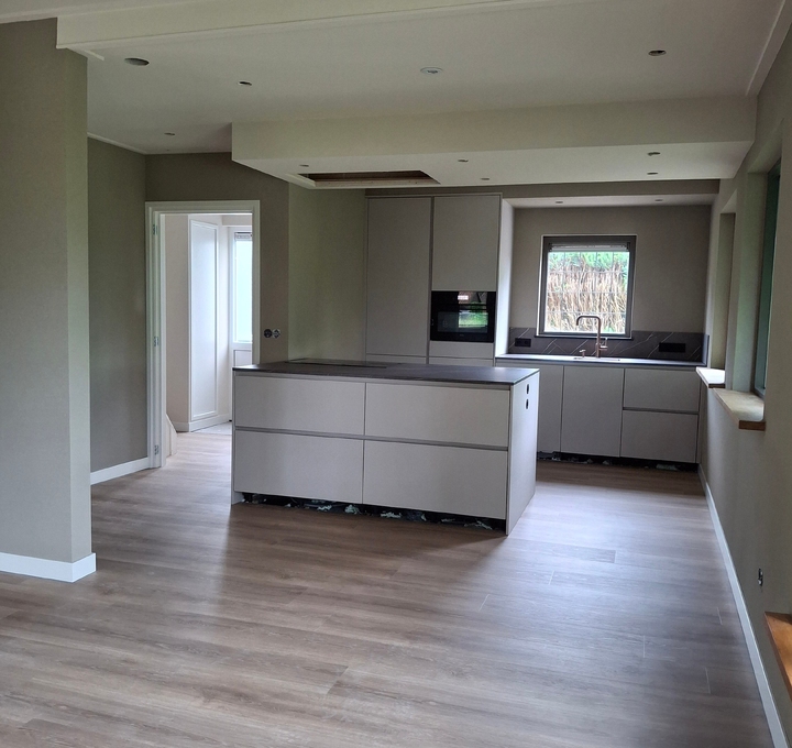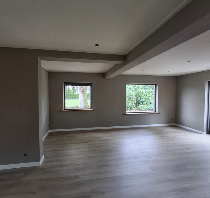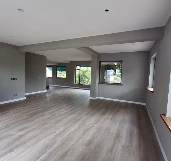 Deze woonkamer met keuken en entree, zijn volledig aangepakt. Van stucwerk tot en met spackwerk; in 2 kleuren.
